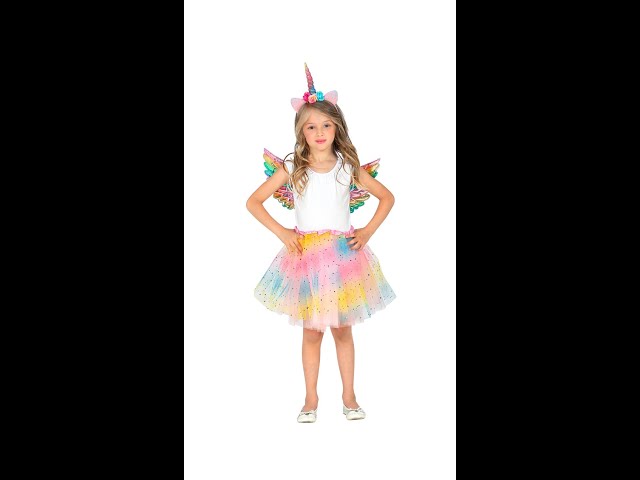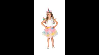 Il tutù multicolore è il cuore del travestimento, con strati di tulle soffice e vaporoso nei toni pastello, che creano un effetto fatato e sognante. Il tessuto è decorato con paillettes a forma di stella e luna, che riflettono la luce e aggiungono un tocco di brillantezza e magia, perfetto per far risplendere ogni bambina come un vero unicorno delle fiabe.